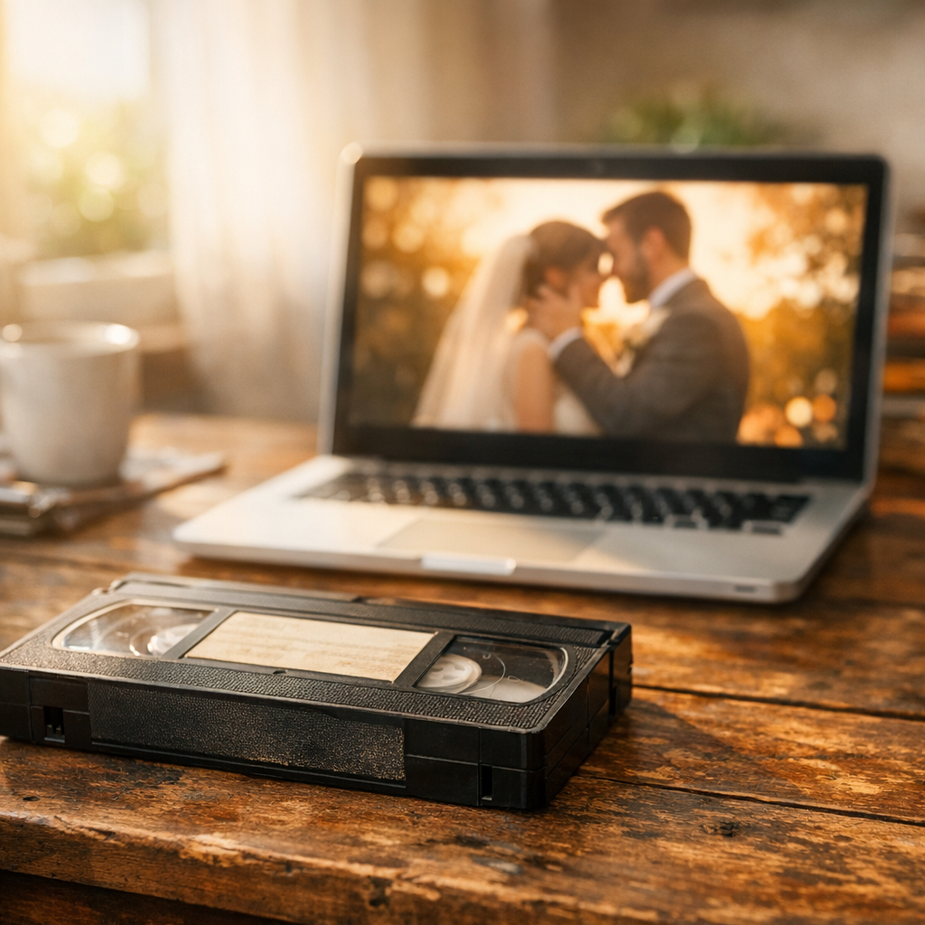 В глубине антресолей лежала коробка с надписью «Свадьба 1998». Внутри — видеокассета VHS, последний раз просмотренная лет пятнадцать назад. Видеомагнитофона в доме давно нет. Но желание показать детям, как выглядели молодые родители на свадьбе, оказалось сильнее технических препятствий.
