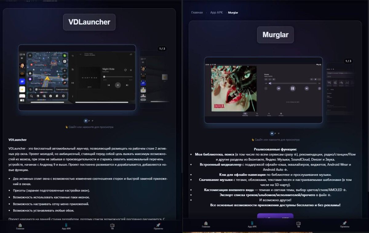 🔥 VDLauncher - Изначально разрабатывается и тестируется на устройствах TopWay и CarBox, поэтому на них работает максимально стабильно. Уже ждём обновление, в котором появится больше полезной информации и дополнительных возможностей. Скачать: https://launcheravto.ru/app/VDLauncher.php Murglar - плеер с поддержкой сразу нескольких музыкальных сервисов и источников. Отличное решение, если хочется объединить музыку в одном месте без лишней нагрузки на систему. Особенно полезно для слабых ГУ. Скачать: https://launcheravto.ru/app/Murglar.php Для лаунчера: если при установке появляются ошибки - чаще всего дело в проверке подписи. В таком случае нужно отключать проверку через специальные программы. Как это сделать - возможно скоро покажем отдельной инструкцией. Следим за обновлениями, тестируем и делимся только тем, что реально работает 💪