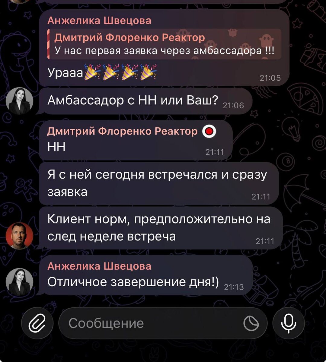 С полей. Новая ниша - бизнес клуб. Наш партнер Анжелика Швецова вместе с собственником бизнеса Димой Флоренко получили первый лид от амбассадоров. Мои поздравления 🥳 Дальше - больше. О том, как работает отдел амбов я писал в посте выше 👆🏼 Для тех, кто не в теме. Это управляемое сарафанное радио :-) кому нужны Лиды с оплатой за факт сделок, делайте себе отдел амбассадоров :-) А чтобы он давал лиды, стройте его вместе с Партнерами Edler.pro Мы умеем делать отделы амбасадоров офигенно 😀 ТГ Анжелики @A_anzhelikaa У нее очередь, так что записывайтесь заранее :-)