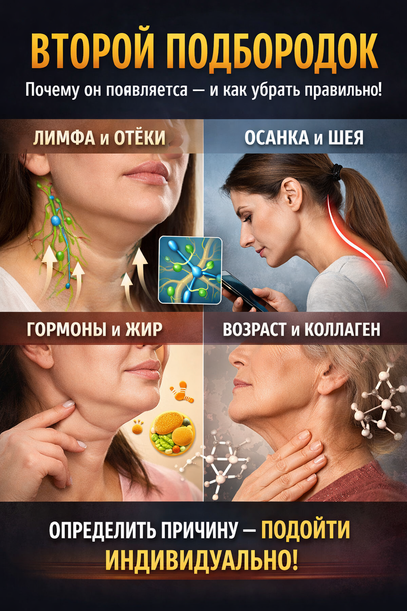 • жировые пакеты... Если нарушается баланс хотя бы в одном звене — ткани начинают «провисать». Важно понимать: подбородок — это не отдельная зона. Это часть системы «стопы — таз — грудная клетка — шея — череп». Когда голова выдвигается вперёд (forward head posture), нагрузка на шейный отдел увеличивается в 2–3 раза. Платизма укорачивается, подъязычная зона спазмируется, лимфа застаивается. И вы видите второй подбородок. Признаки: мягкий, меняется в течение дня, усиливается после соли и недосыпа. Механизм: замедленный лимфоотток + зажатые мышцы + малоподвижная шея. Что важно: сначала открываем лимфатические коллекторы (надключичная зона), только потом работаем с подбородком. Ошибка — сразу «месит