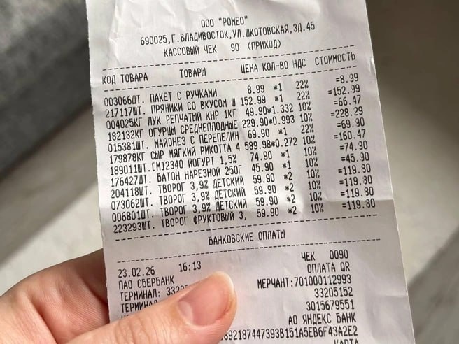 ? Мы решили проверить, как живут и закупаются приморцы — от одиночек до больших семей из 5 человек и больше. Первыми в нашей рубрике — семья из двух человек с котом, у которого плохое здоровье. Их месячный чек равен в среднем 23 тысячам рублей, но есть несколько оговорок: 🟥дома обед они не готовят, соответственно, не покупают продукты на это; 🟥 такие вещи, как какао, кофе и чай, картофель, фрукты, фарш, консервы, ягода, масло и любое варенье, появляются в семье в виде гостинцев от родственников и друзей. Что входит в основной список и сколько молодые люди тратят на спонтанные покупки — читайте в материале. А если готовы провести такой эксперимент и рассказать о своих походах в супермаркет, пишите в бот, мы расскажем, что для этого нужно. ➡️Подписаться в MAX 💬 Предложить новость