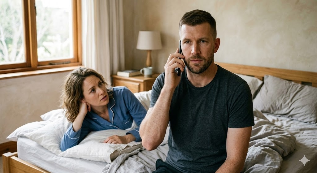 Она вышла из кухни. Арсений замер в дверном проёме — спиной к ней, рука на ручке двери. Не двигался.