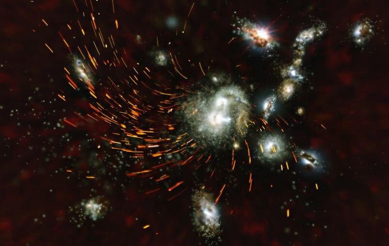 Долгое время астрономы не могли понять, откуда в ранней Вселенной взялись крупные эллиптические галактики. По расчетам, времени на их формирование через обычные иерархические слияния просто не хватало. Группа под руководством Николауса Зульценауэра (Nikolaus Sulzenauer) из Института радиоастрономии им. Макса Планка (MPIfR, Германия) предложила механизм, который объясняет этот феномен. Скопления молодых галактик в ранней Вселенной, которые впоследствии разрастаются в крупные скопления, называются протоскоплениями. Авторство и ©: N.Sulzenauer/MPIfR Ученые наблюдали протокластер SPT2349-56 в созвездии Феникса через телескоп ALMA. Объект существовал всего через 1,4 миллиарда лет после Большого взрыва. В центре они обнаружили четыре тесно взаимодействующие галактики, которые выбрасывали гигантские приливные рукава ионизированного газа со скоростью около 300 километров в секунду. Протяженность этих структур превышала размеры Млечного Пути. Там звезды рождались с чудовищной скоростью — одна к