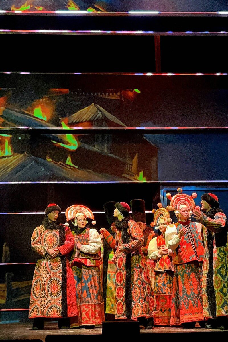 Погружение усиливают многоуровневые декорации подобные календарю с хронологиями событий, эффектный видеомэппинг, стилизованные исторические костюмы (мы со второго рада любовались изысканными расшитыми кафтанами и рукотворными кокошниками) и впечатляющие массовые сцены, где каждый актер ярок и самобытен.