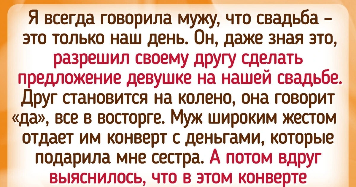 Я всегда говорила мужу, что свадьба — это только наш день. Он, даже зная это, разрешил своему другу сделать предложение девушке на нашей свадьбе. Друг становится на колено, она говорит «да», все в восторге. Муж широким жестом отдает им конверт с деньгами, которые подарила мне сестра. А потом вдруг выяснилось, что в этом конверте было почти в двадцать раз больше, чем подарила нам эта парочка. Девица еще и беременна оказалась, весь вечер все с ними фотографировались, поздравляли. Попыталась с ней по-хорошему решить, вернуть конверт — она уперлась и не отдает. Муж посодействовать отказался — ты что, я же лучшему другу подарок сделал, он мой братишка. Но ничего, карма тех двоих настигла — еще до родов они разбежались, ребенка девушка растит теперь одна. Ну и я развожусь: раз муж так себя повел, то и дальше друзья ему будут дороже семьи.