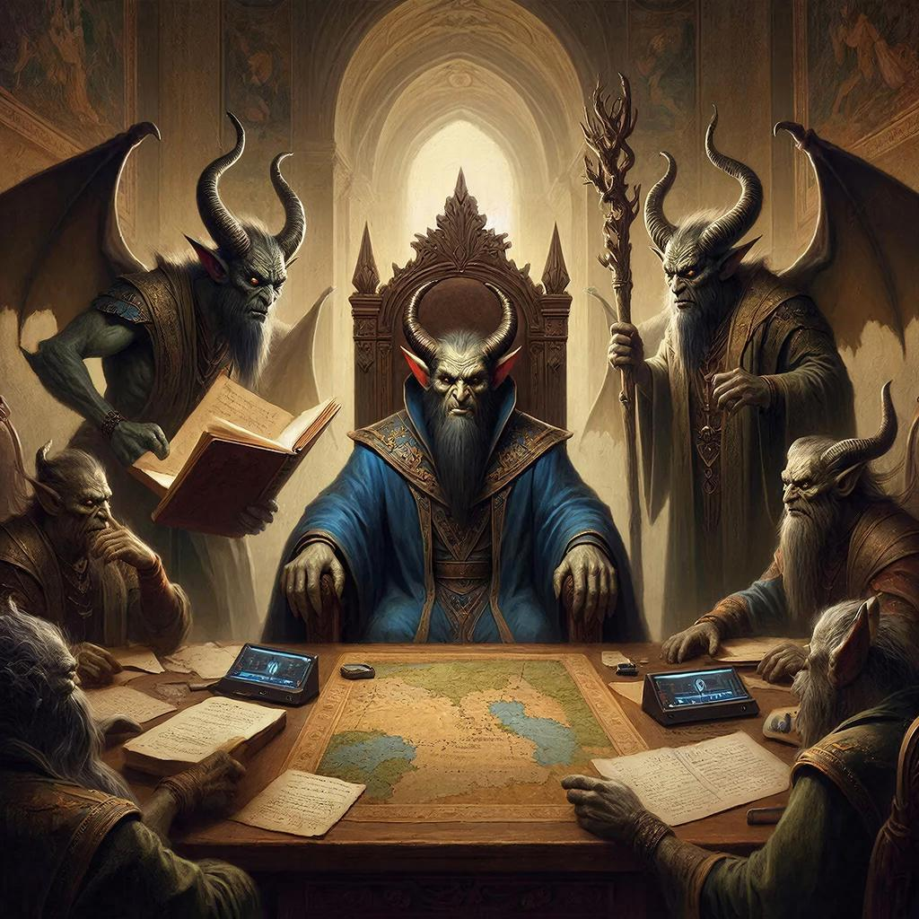 Его помощники-демоны, одетые в скромные одеяния, заняты каталогизацией и обработкой новых поступлений. Особое внимание уделяется редким экземплярам, которые бережно хранятся в стеклянных витринах, оснащённых системами климат-контроля.