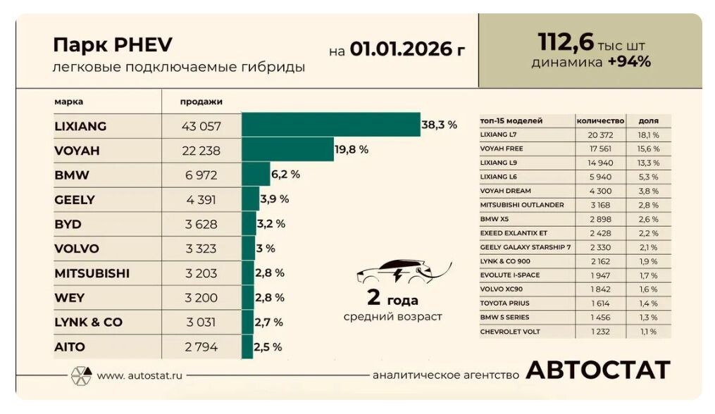 📊Гибриды в России продолжают набирать обороты. По данным главы агентства «Автостат» Сергея Целикова, сейчас в стране зарегистрировано 112,6 тысячи гибридных автомобилей — это +94% за год. Фактически рынок почти удвоился ⭐️И самое интересное — в топе всего две марки. 📈 Лидеры по брендам: 🥇 Lixiang — более 43 000 автомобилей 🥈 Voyah — 22 238 машин 🥉 BMW — чуть менее 7 000 Также заметную долю занимают гибриды Geely, BYD и Volvo. В топ-5 попали только Lixiang и Voyah: • Li Auto L7 • Voyah Free • Lixiang L9 • Lixiang L6 • Voyah Dream 💊 На эти пять моделей приходится более половины всего гибридного автопарка России. В 2025 году было продано 44,8 тысячи новых гибридов, при этом активно ввозились и автомобили с пробегом. В результате средний возраст гибридов в России — всего 2 года, что говорит о свежем и быстрорастущем сегменте. А вот дизель теряет позиции: 📉 В 2025 году продажи дизельных авто упали почти на четверть. Чаще всего «на тяжёлом топливе» покупали кроссоверы и внедоро