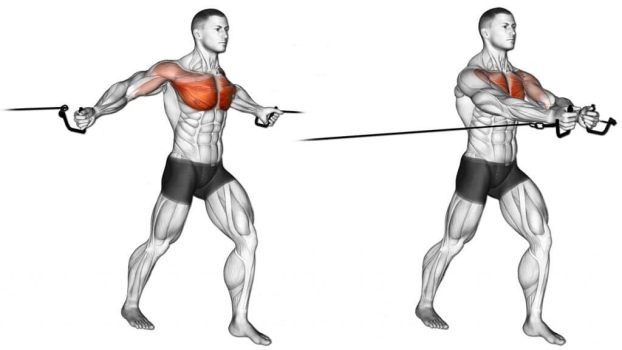- Встать в центре кроссовера, держа рукоятки кабелей в руках.