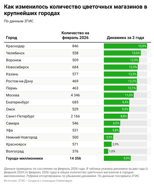 За два года число цветочных магазинов в Петербурге выросло на 8,8%, достигнув 2166 точек, подсчитали в сервисе 2ГИС. Как сообщал ранее Forbes со ссылкой на «Авито Бизнес 360», число желающих открыть цветочный магазин растёт. В январе 2026 года спрос на покупку такого бизнеса вырос в 3,9 раза по сравнению с тем же периодом 2024-го, а за последние 4 месяца интересующихся стало больше в 2,2 раза. Подробнее: https://www.dp.ru/api/amp/a/2026/02/26/tjulpanom-menshe-chasto-li Фото: ДП