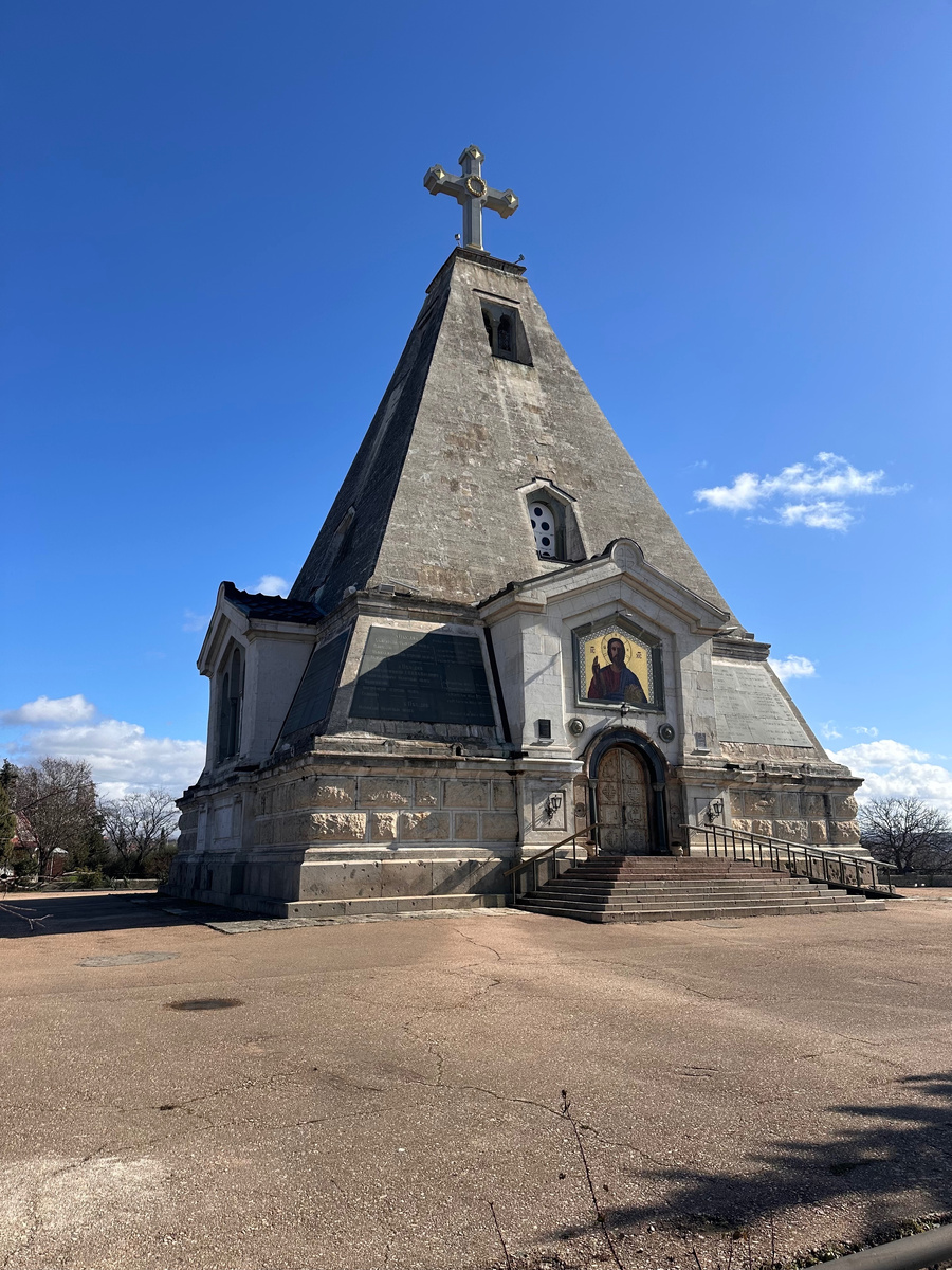 Удивительное и сакральное место В десяти километров от Инкерманского пещерного монастыря (контрольная точка 24 нашего маршрута) на Северной стороне Севастопольской бухты находится православный храм-памятник на Братском мемориальном кладбище. Он является одним из главных архитектурных символов Севастополя: уникальный образец культовой архитектуры второй половины XIX век — храм, сооруженный в виде пирамиды, одновременно являющийся памятником защитникам Севастополя в период Крымской войны 1853-1855 гг. Находясь на холме возле могил с останками героических воинов своей Отчизны, в благоговейной тишине ты созерцаешь прошлое и настоящее города, который они защищали. Строительство храма началось в 1856 году на добровольные пожертвования, которые поступали со всей России. Люди всех сословий – офицеры и чиновники, солдаты и матросы - присылали деньги на увековечивание памяти о погибших. Храм строился в течение 13 лет на народные деньги. Местом закладки храма стала вершина холма, на котором распо