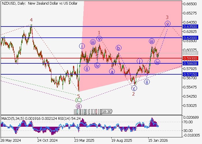 NZD/USD: волновой анализ Вероятность роста сохраняется. На дневном графике развивается восходящая волна C, в составе которой сформировались первая волна младшего уровня 1 of (1) of C и коррекция в качестве второй волны 2 of (1) of C, а также образуется третья волна 3 of (1) of C. На четырёхчасовом временном интервале уже появилась волна iii of 3, окончена коррекция в качестве волны iv of 3 и идёт построение волны v of 3. Если предположение верно, восходящая динамика пары NZD/USD продолжится в район 0.6200–0.6350, а критическим уровнем стоп-лосса для данного сценария видится 0.5930. Срок реализации: 7 дней. До 06.03.2026 Рекомендация: BUY Цена входа: 0.6007 Тейк профит: 0.6200, 0.6350 Стоп Лосс: 0.5930 Ключевые уровни: 0.5715, 0.5860, 0.5930, 0.6200, 0.6350 ID прогноза: 274