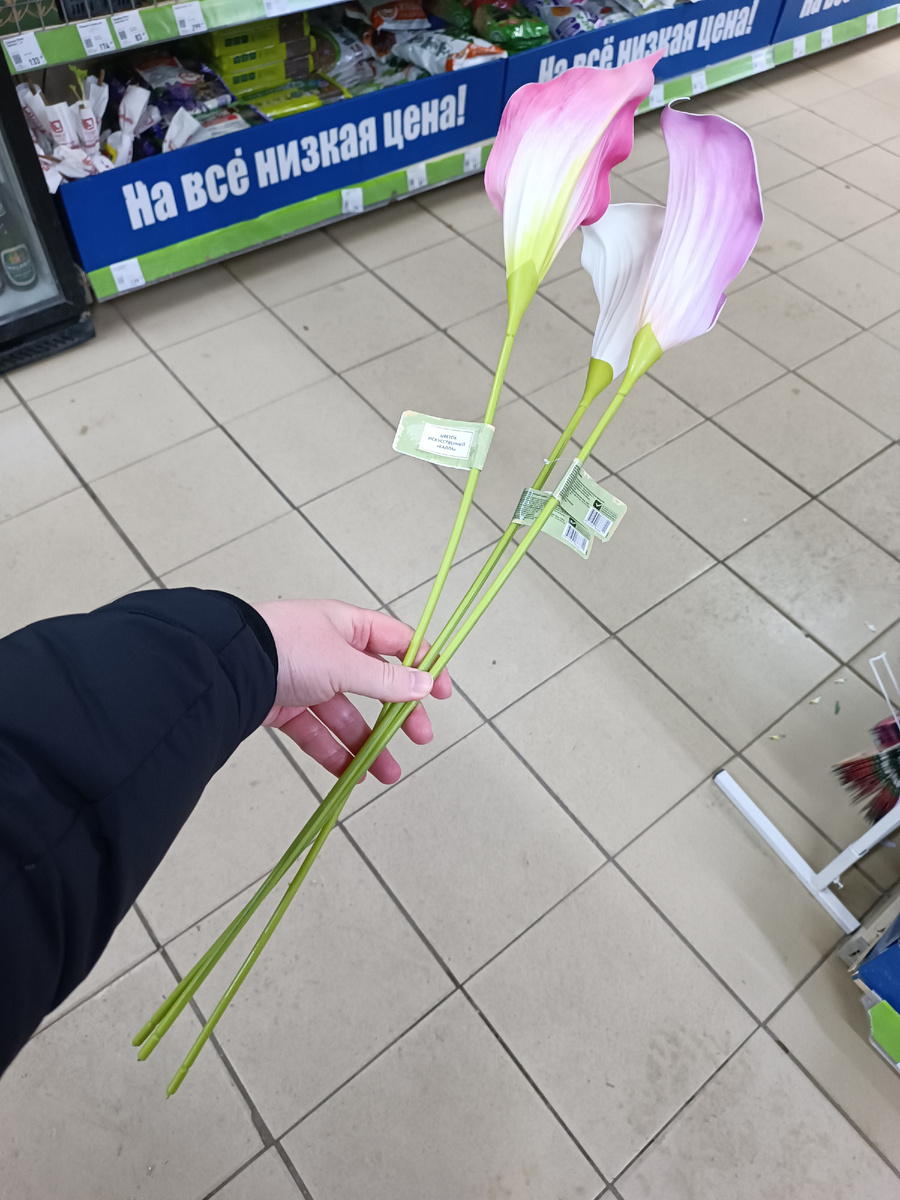 Прелестные каллы появились, даже не ожидала, что они мне так понравятся. Три ветки, три цвета, продаются по одной штуке.