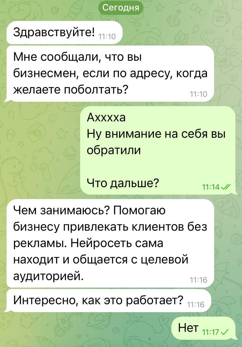 Очень похоже, что это диалог и правда был с помощью нейросетей Ошибка лишь в том, что в бизнесе от людей и для людей не должно быть роботов. Если вы кто-то уровня ростелеком, то без автоматизации не обойтись. Но давайте честно - мы почти все работаем сами на себя. Поэтому после переписки с ИИ человек приходит к вам и понимает, что вы - не тот за кого себя выдавали. И еще есть стойкое чувство, что в случае проблем вам не помогут. Так что сильно подумайте, нужна ли вам ТАКАЯ автоматизация?