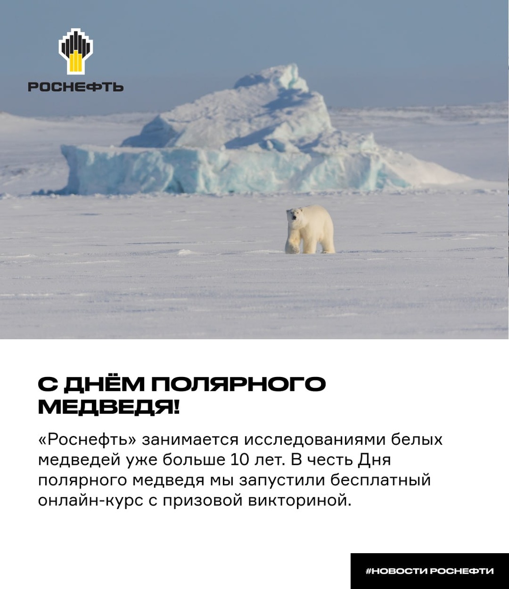 Его называют хозяином Арктики и полярным странником. Белый медведь проходит сотни километров по льдам, ныряет в ледяную воду и живёт в условиях, к которым не приспособлен ни один другой наземный хищник. 🎉 27 февраля — День полярного медведя. 🏢 «Роснефть» занимается исследованиями белых медведей уже больше 10 лет: учёные отслеживают маршруты миграции, состояние популяций и заботятся о белых медведях во всех зоопарках страны. 🎁 Мы запустили бесплатный онлайн-курс «Арктический странник: белый медведь». В финале курса — викторина: первые пять участников с правильными ответами получат подарки от «Роснефти». Участвуйте и проверяйте, сколько вы знаете о хозяине Арктики 👈🏻