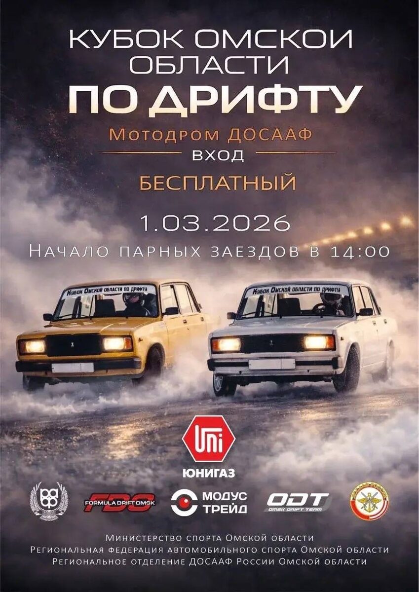 Соревнования по дрифту с одиночными и парными заездами на мотодроме. Участники разыграют медали в атмосфере скорости и профессионального мастерства. Начало: 01 марта 2026 10:30 Стоимость: Бесплатно Адрес: г Омск, 3-я Островская, 2а Организатор: https://vk.com/public202102013 1 марта на мотодроме ДОСААФ (ул. 3-я Островская, 2а) состоится Кубок Омской области по дрифту 🏁 Участники разыграют медали в одиночных и парных заездах🚘 🕰️Соревнования начнутся в 10:30, торжественное открытие запланирвоано на 14:00. ☝️Приглашаем всех желающих окунуться в атмосферу скорости, риска и профессионального мастерства! #техника_авто Узнать подробности, адрес или записаться на событие.