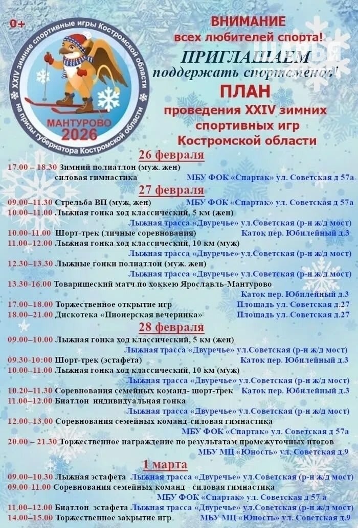 С 26 февраля по 1 марта в Мантурово проходят XXIV Зимние спортивные игры Костромской области на призы губернатора региона. В соревнованиях принимают участие команды 29 муниципалитетов области. За победу в спортивных состязаниях ведут борьбу более 500 спортсменов. В программе - лыжные гонки, полиатлон, биатлон, конькобежный спорт, соревнования семейных команд и глав муниципальных образований. Сборную команду Шарьи возглавляет исполняющий полномочия главы города Зеленов Сергей Павлович. Наша главная надежда на лыжне: Рычкова Ирина, Гребенкина Анастасия, Рябов Даниил, Дмитриев Егор. Честь города на соревнованиях семейных команд будут защищать Чёкотовы Павел, Юлия и Варвара. В конькобежном спорте Шарью представляют Дворецкий Михаил и Шапошникова Анастасия. Биатлон, полиатлон - Жиляева Мария, Чёкотов Алексей. Пожелаем им удачи и победы! Шарья – столица мира Крупнейшее городское СМИ Источник: Открыть