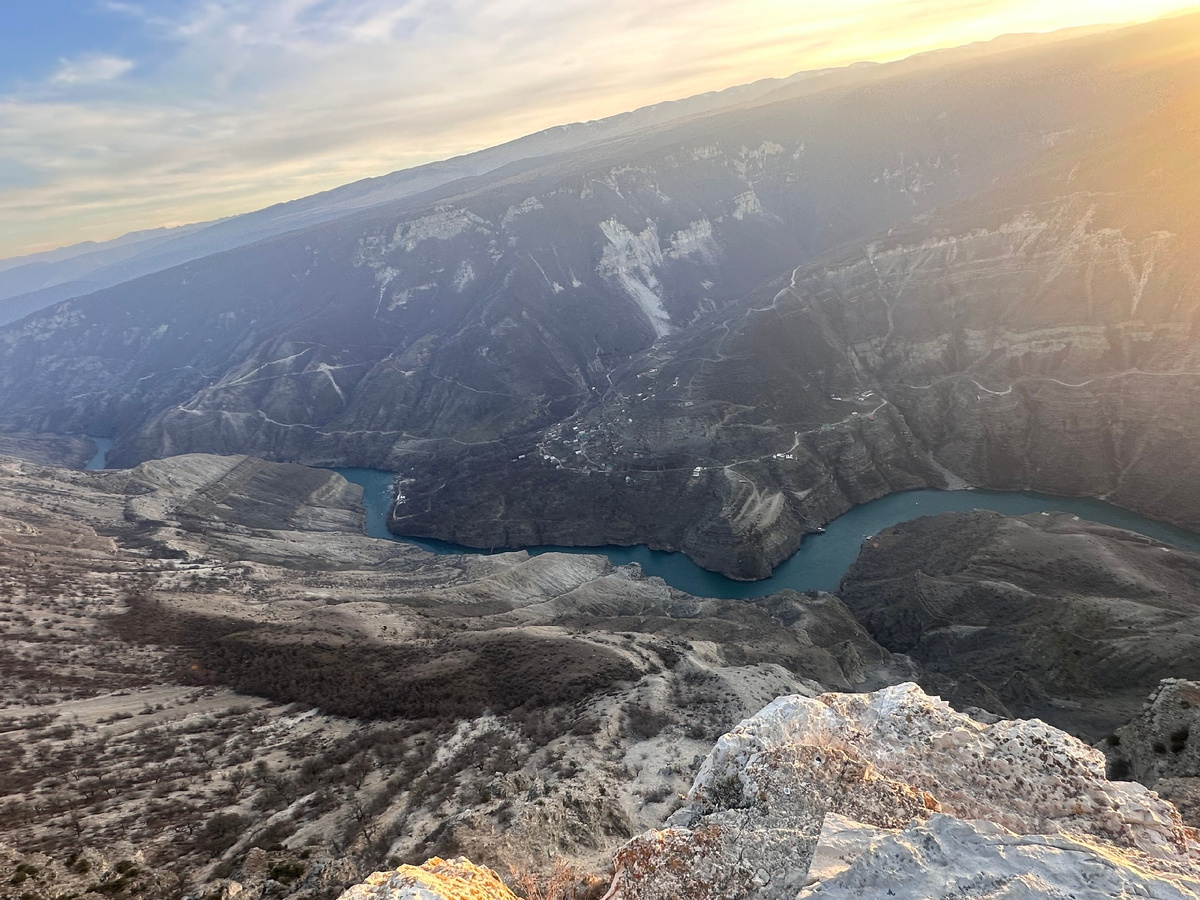 Это было моё второе посещение смотровых площадок с видом на Сулакский каньон. Сначала заехали на одну из смотровых близ посёлка Дубки, в мае мы были на другой площадке- у Дубков их несколько. По сравнению с майской поездкой было огромное преимущество: полное отсутствие людей!!! Не было продажи сувениров, предложений сфотографироваться в платье или на лошади, не выстраивались очереди для фото в наиболее выигрышных локациях... Одна наша не очень большая группа- и всё!!! Гуляй, фотографируйся или просто сиди и созерцай закат, свесив ноги в пропасть! Закат, кстати, придал нашему посещению дополнительную нотку величия и таинственности! По дну каньона протекает река Сулак, по которой он и получил своё название. Река имеет ледниковое происхождение, длина её- около 170 км. Один из переводов названия звучит как "овечьи воды". В этот раз овец не заметили, а вот домашние козы, притворяющиеся дикими, ходили! Глубина каньона достигает 1920 метров, то есть если его доверху заполнить водой, то он ок
