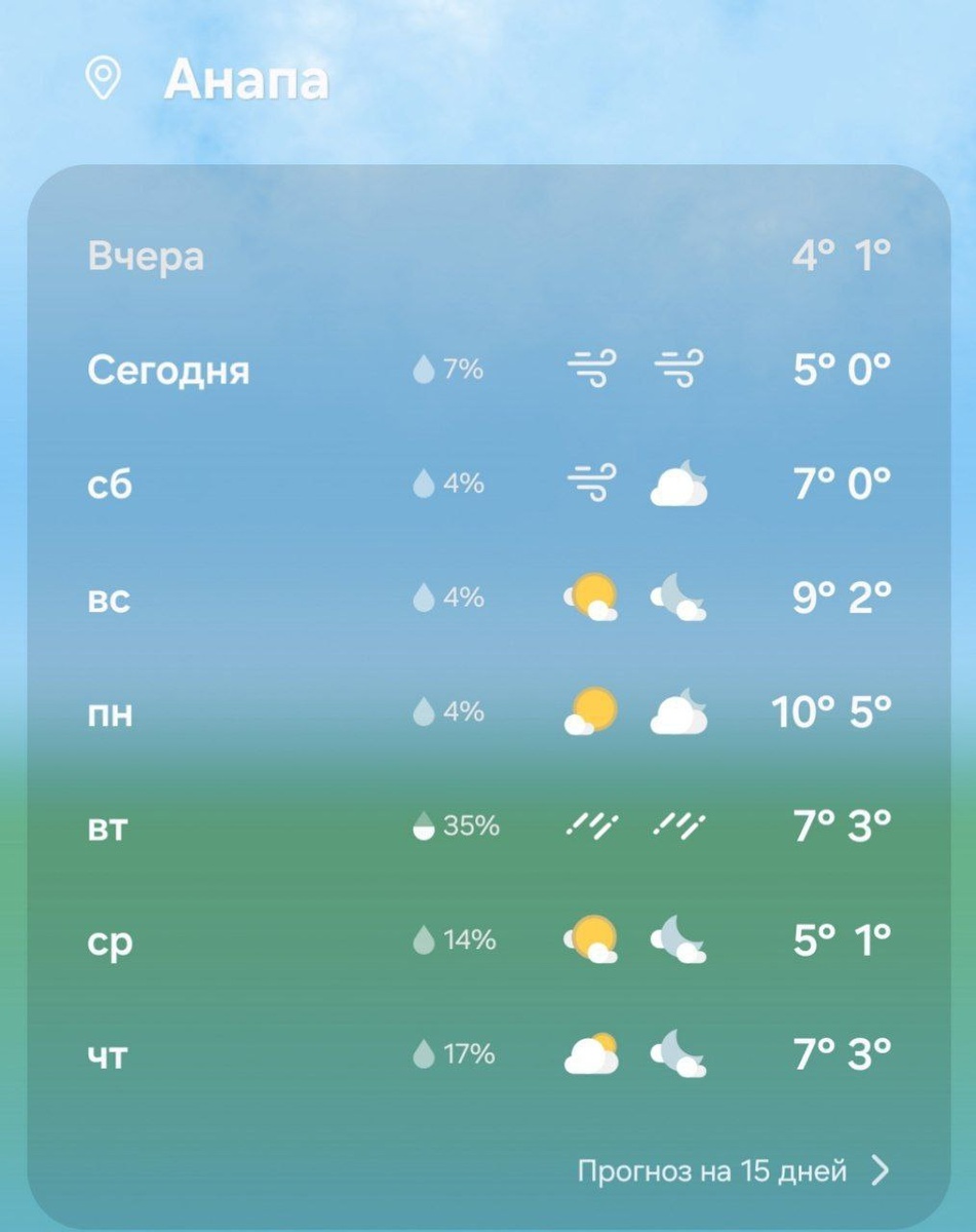 Доброе утро, дорогие друзья! 🌥️ Сейчас за окном пасмурно и ветрено. Северный ветер пришёл к нам минимум на три дня, принеся с собой ощутимое похолодание. 🌡️ На градуснике +1°C, но по ощущениям все −6°C. Одеваемся теплее — главное, чтобы одежду не продувало. ☁️ Осадков в прогнозе нет, но и настоящего тепла в ближайшие две недели тоже не видно… 🌱 Где же ты, наша тёплая весна? Берём тёплые куртки и продолжаем ждать настоящую весну 🤍 А как с погодой в ваших городах? Делитесь в комментариях 👇 Прекрасного дня и хорошегоо настроения. Не забывайте делиться фото и видео из окрестностей города любви! 🌡Температура воздуха +5 +0°С 🌊Море +9°С 💨Скорость ветра 11-15м/с ☔️Осадки 00мм !