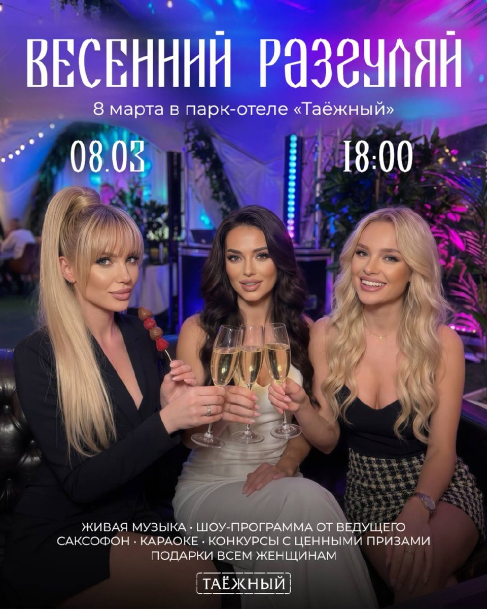 ! Петь громко. Танцевать смело. Смеяться красиво 🤌🏼 Приглашаем вас на весеннюю вечеринку по случаю Международного женского дня в парк-отель «Таёжный»! 🗓️ 08.03 | 18:00-22:00 📍 ресторан «Таёжный» Для вас — живая музыка с саксофонистом и шоу-программа от ведущего с классными конкурсами и ценными призами! Будем петь любимые песни в караоке и танцевать до упаду 💃🏻🪩✨ Приятный комплимент для всех леди в этот день — бокал игристого и малина в шоколаде 🥂 Собирайте подруг и приезжайте отмечать женский праздник так, как вы мечтали! Забронировать стол можно в чате: @park_otel | количество мест ограничено До встречи на самой красивой вечеринке этой весны 🤍