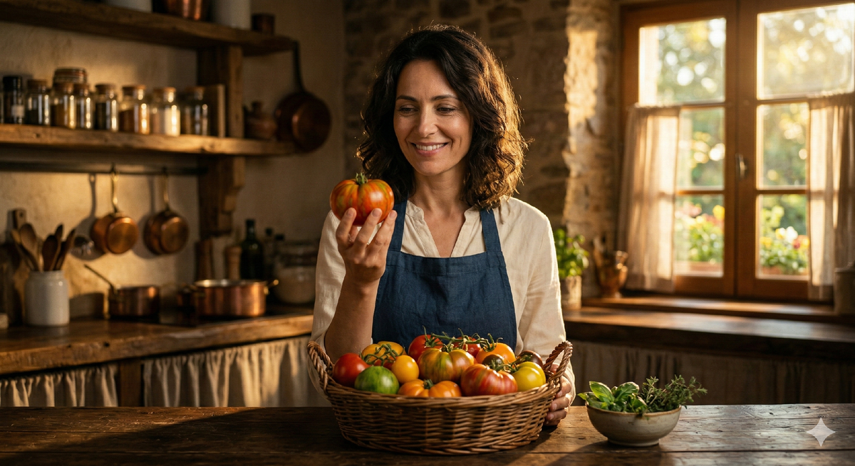 Августовский полдень наполнял просторную кухню старинного загородного дома под Суздалем густым, медовым светом. Воздух здесь был пропитан ароматами сушеных трав, свежего базилика и нагретого солнцем дерева. На массивном дубовом столе, в широких плетеных корзинах, лежало настоящее сокровище — свежий урожай коллекционных томатов. Крупные, налитые соком плоды переливались всеми оттенками: от глубокого бордового до золотисто-желтого и изумрудно-полосатого.
