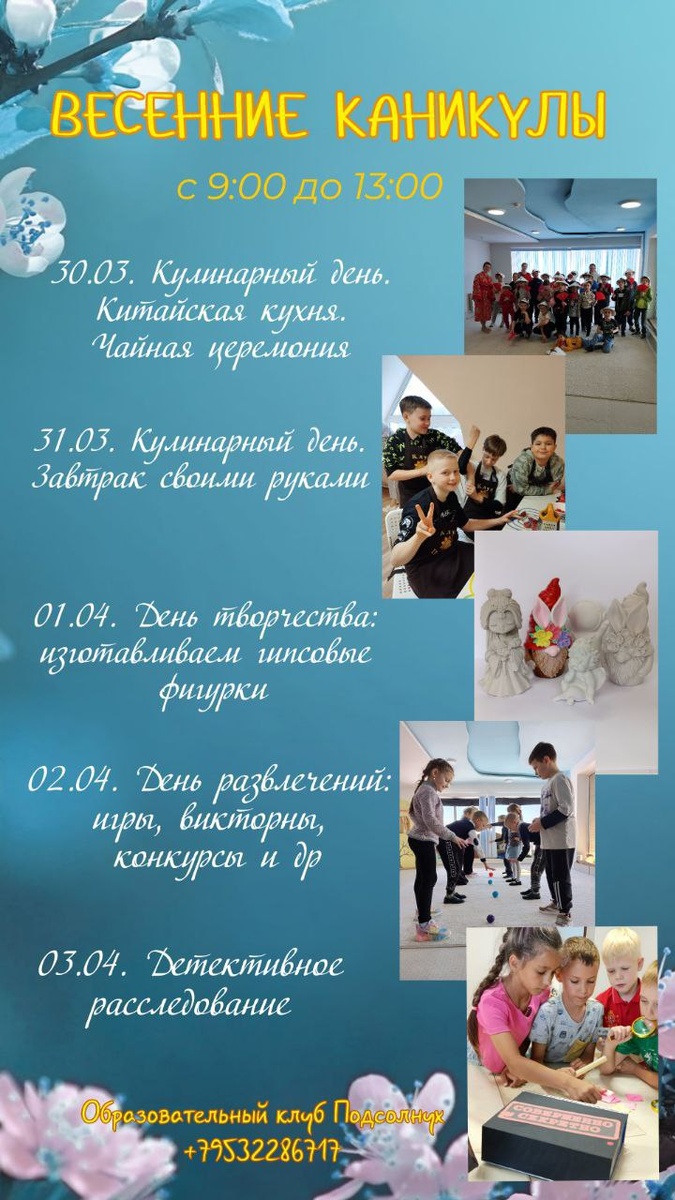 🌻 с 30 марта по 3 апреля с 9.00 до 13.00 Каждый день: 🥐Чай с фруктами, выпечкой и бутербродами ⚾️Подвижные и интеллектуальные игры 🌳Прогулки на свежем воздухе 🥳Радость и веселье Запись открыта! Количество мест ограничено! Можно прийти на один день или записаться на всю неделю: Запись по ссылке➡️https://forms.gle/oC7oEkTKToX418Kf9 Образовательный клуб Подсолнух +79532286717