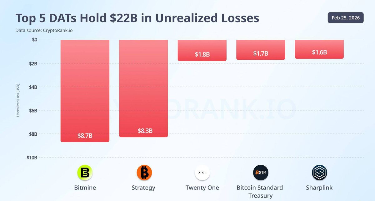 Компании с большими запасами криптовалют, ранее считавшиеся потенциальным риском для рынка, сейчас терпят значительные нереализованные убытки 🔸Bitmine — $8,7 млрд 🔸Strategy — $8,3 млрд 🔸Twenty One — $1,8 млрд 🔸Sharplink — $1,6 млрд 🔸BTC Standard Treasury — $1,7 млрд Убытки одного только Bitmine больше краха FTX, который составил около $8 млрд @HURMA NEWS