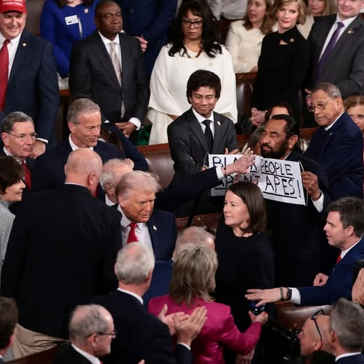 Вечером 24 февраля президент Дональд Трамп выступал в Капитолии с ежегодным посланием о положении страны - и почти сразу в центре внимания оказался 78-летний конгрессмен от Техаса Эл Грин - демократ, работающий в Палате представителей с 2005 года. Когда Трамп вошел в зал, Грин развернул белый плакат с надписью "Black people aren't apes" - по-русски это обычно переводят как "Чернокожие - не обезьяны" - после чего его вывели из зала сотрудники, отвечающие за порядок. Демонстрация была подчеркнуто молчаливой, но в зале она выглядела как прямая конфронтация: по описанию The Guardian, Грин стоял в проходе с плакатом и тростью, пока его сопровождали к выходу, а несколько республиканцев пытались закрыть плакат от камер или выхватить его. И это на фоне скандирования USA! USA! Причина плаката - скандал вокруг ролика, который в начале февраля появился в аккаунте Трампа в его соцсети Truth Social: в минутном видео с тезисами о "фальсификации" выборов 2020 года была вставка, выглядевшая как сгене