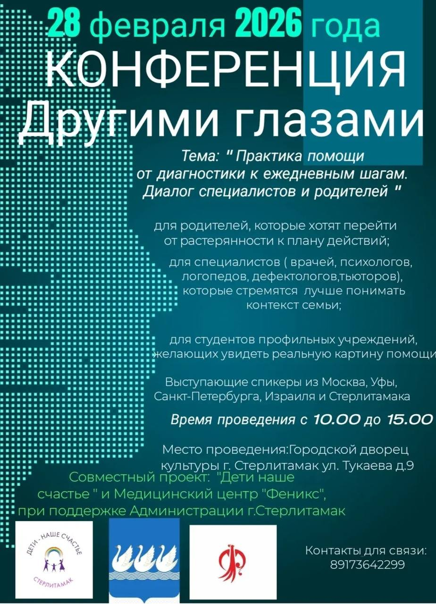 В субботу, 28 февраля, с 10 до 15 часов в Городском дворце культуры состоится конференция для родителей детей с ОВЗ "Другими глазами". Конференция также будет полезна для семей, где растут дети с СДГВ, задержкой психоречевого развития, а также для педагогов и педиатров – всех, кто взаимодействует с детьми в наше непростое время. Спикеры – врачи из Стерлитамака, Уфы, Санкт-Петербурга и Москвы (неврологи, эпилептологи, нейрогенетики, психиатры, клинические психологи, психотерапевты, остеопаты), учёные БГМУ, представители благотворительного фонда. Общение со специалистами будет проходить в оффлайн и онлайн-форматах. Участие в конференции безоплатное, нужно только зарегистрироваться: https://forms.yandex.ru/u/699866c7eb61468f19790a5f/