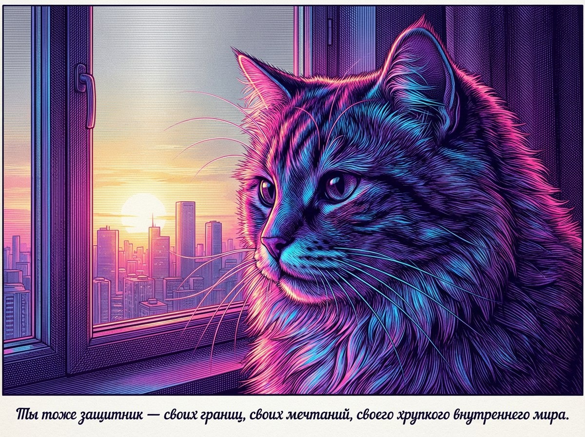 Посмотри, как рассвет расправляет плечи, как небо тихо переливается от нежного серебра к золотистому свету. Сегодня в России вспоминают защитников Отечества, и я хочу напомнить тебе: ты тоже защитник — своих границ, своих мечтаний, своего хрупкого внутреннего мира. Ты имеешь право идти в своем ритме, как я, когда выбираю мягкий шаг и точный прыжок. Пусть этот день станет тихим обещанием самому себе: бережно относиться к своим чувствам, смело говорить своим надеждам «да» и не бояться начинать сначала. Утро — это доказательство, что мир дает тебе еще один шанс, а я, твой кот-наблюдатель, мягко верю в твой свет.