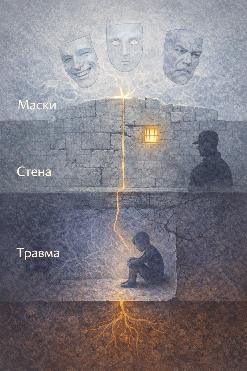 Важно понимать: маски — это не ложь в бытовом смысле. Человек не притворяется специально. Он действительно стал таким, чтобы выжить. Но проблема в том, что за масками нет живого лица. Там стена. А за стеной — кричащая от боли травмированная часть.