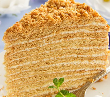 Ингредиенты: Для теста: - 3 яйца - 1 стакан сахара - 1 ч. л. соды - 3 ст. л. меда - 1 кг пшеничной муки Для крема: - 1 банка сгущенного молока - 250 г сливочного масла - 100 г сметаны высокой жирности Приготовление: Яйца и сахар взбить. Смешать смесь с растопленным медом и содой. Добавить муку. Разделить полученное тесто на 8 частей. Раскатать по размеру сковороды. Сковороду нагреть и присыпать мукой. Выложить тесто на сковороду. Обжарить с двух сторон, не засушивая. Остудить. Сложить все коржи “стопочкой” и обрезать, выравнивая края. Из остатков сделать крошку для посыпки. Взбить крем из сгущенки и масла. Ввести сметану, тщательно перемешать. Промазать коржи кремом и посыпать крошкой. Дать настояться в течение дня.