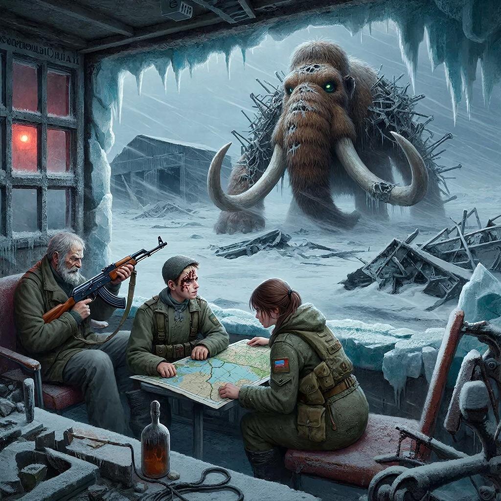 Тварь была огромной и напоминала медведя, но только отдалённо. Её шерсть свалялась в бурые сосульки, свисая с туши, как саван. Из неё торчали осколки костей и куски арматуры, вмёрзшие в плоть. Глаза горели болотно-зелёным светом — тем самым, о котором говорила Катя. Вместо морды копошились жвала, полные острых игл, покрытых инеем. Это был мамонт-реквием.