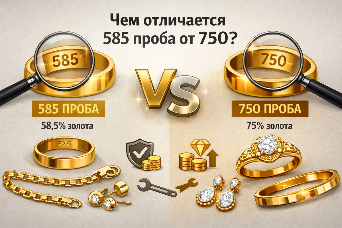 Когда вы выбираете золотое украшение, почти всегда видите цифры 585 или 750. Это и есть проба — показатель того, сколько чистого золота содержится в изделии. Разберёмся простыми словами, в чём разница и что лучше выбрать. Проба показывает, сколько граммов чистого золота содержится в 1000 граммах сплава. Чем выше проба — тем больше в украшении настоящего золота. Особенности Почему прочнее? Потому что в составе больше других металлов, которые делают сплав твёрже. Кому подойдёт Тем, кто ищет украшение на каждый день — цепочку, браслет, серьги или обручальное кольцо. Особенности 750 проба соответствует 18 каратам — это международный стандарт премиального золота. Кому подойдёт Тем, кто покупает украшение «на выход», инвестиционное изделие или подарок высокого уровня. 750 проба дороже, потому что в ней больше чистого золота. Но это не значит, что она всегда «лучше». Всё зависит от цели покупки. Выбирайте 585, если: Выбирайте 750, если: 585 — это надёжное, практичное золото на каждый день. 75