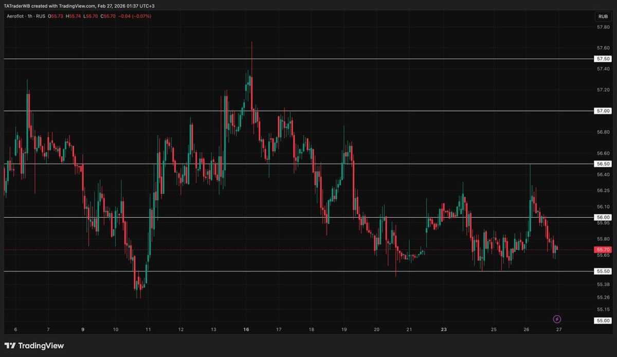 Поэтому сегодня в приоритете бы работал от шорта. Думаю работать с: $AFLT Планирую присмотреть шорт на, ложный пробой 56. ✅ Тейк поставлю +1 - 2%. Стоп поставлю 0,5%. При достижении +0,5% поставлю стоп в без убыток. Это условие торговли, то есть если будет вход, зайду. Не будет входа, НЕ зайду. НЕ призыв к действию. Больше идей в Базе. Если откроется выше уровня, пропущу. Аэрофлот актуален ТОЛЬКо пока он торгуется выше 55,5! Как только Аэрофлот уйдет ниже 55,5 - идея не актуальна! Всем классной пятницы! 🤝
