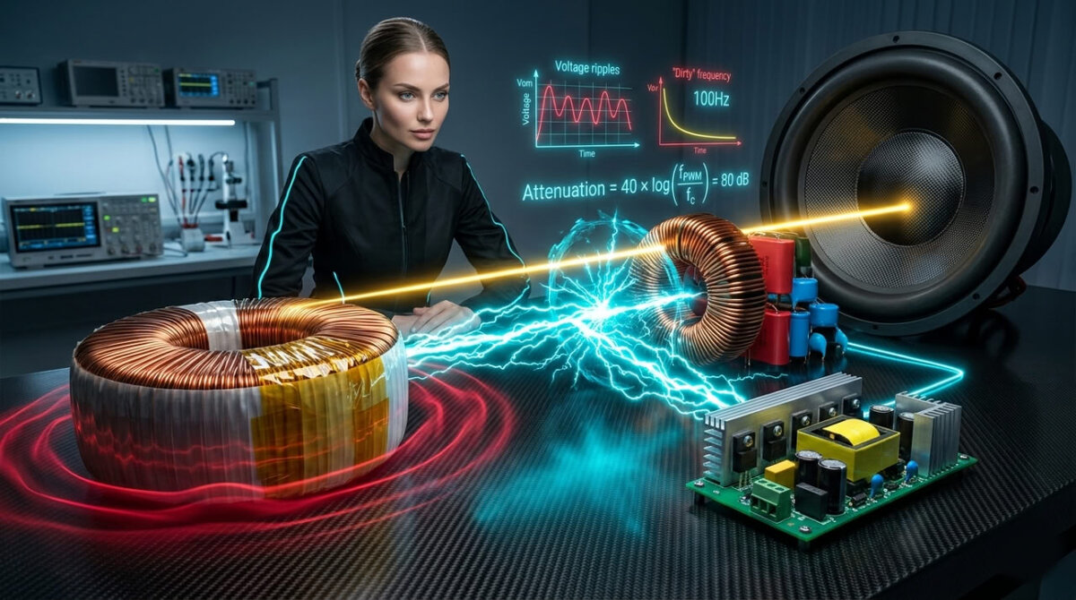 Важное следствие высокой частоты коммутации: если помеха SMPS и проникнет в выходное напряжение, она находится на частоте 100–500 кГц и выше, то есть в 1000–6000 раз выше рабочей полосы сабвуфера. Усилитель с любым разумным ограничением полосы уже сам по себе подавляет такую помеху. Пульсации тора на 100 Гц такой возможности не оставляют - они находятся внутри рабочей полосы.