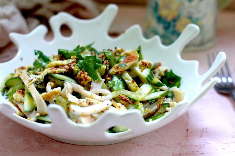 Свежий салат, наполненный белком, с каплей горчицы и нежным омлетом ✔ Кальмары (тушки) – 3 шт.; ✔ Яйца – 2 шт.; ✔ Огурец длинный – 1 шт.; ✔ Соль – по вкусу; ✔ Перец черный – по вкусу; ✔ Горчица зерновая – 2 ч. л.; ✔ Масло оливковое – 1 ст. л.; ✔ Сок лимона – 1 ч. л.; ✔ Петрушка (только листья) – 3 веточки. Кальмары очистить от пленок, отварить в кипящей воде 1 минуту, откинуть на дуршлаг (е переварите!). Остывшие кальмары нарезать кольцами или полосками. Листья петрушки оборвать, нарубить, жесткие стебли не понадобятся. Яйца взбить с солью и перцем, пожарить омлет до момента схватывания яйца. Снять со сковороды, свернуть рулетом, нарезать, полосками. Огурец нарезать соломкой. В соуснике взбить лимонный сок, оливковое масло, соль и горчицу. Выложить в салатник кальмары, огурец, омлет и петрушку, полить заправкой, перемешать и подавать. КБЖУ на 100 г – 98/11,9/5,1/1,2. Рецепт на странице Эндофаллопротезирование — метод лечения эректильной дисфункции, который даёт результат независимо от