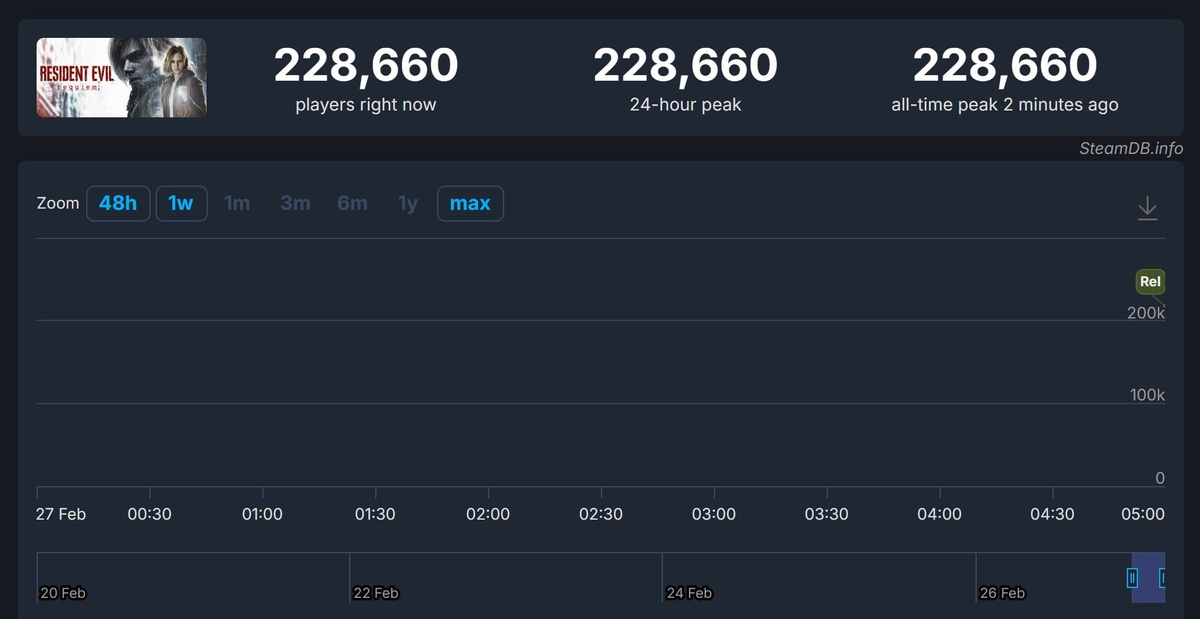 Новый Resident Evil уничтожает топы онлайн игры пробил 228 000 человек спустя 40 минут после релиза. Resident Evil Village на пике имел в 2 раза меньше: всего 106 тысяч игроков одновременно. Результат лучше был только у ремейка 4-й части 168 тысяч. CtrlAltDelights- подписаться