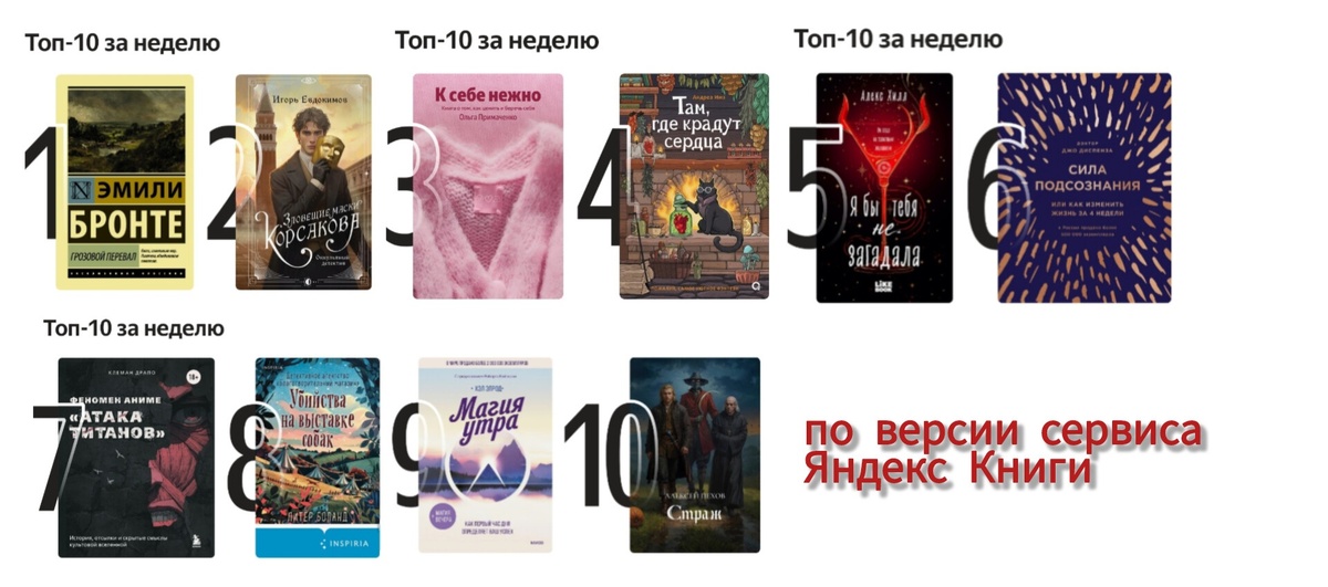 Я обратилась к популярному сейчас сервису Яндекс Книги. Там предлагается Топ-10 книг за неделю. Посмотрим, что на этой неделе чаще всего выбирал российский читатель.