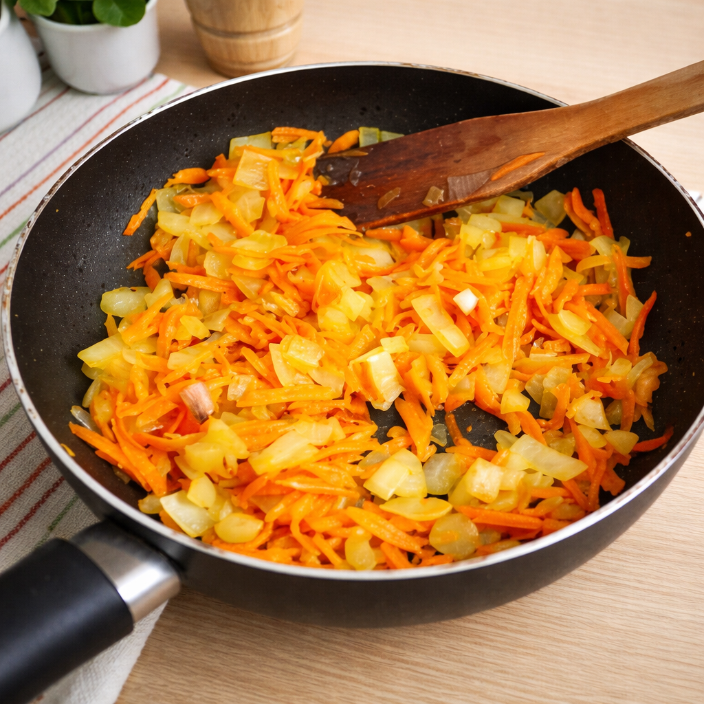 Люблю моменты, когда аромат еды собирает людей вместе. Когда суп уже почти готов, в кухне вдруг появляется тот самый запах — тёплый, сладковатый, густой, как в детстве у бабушки или в хорошей столовой, где варили не наспех, а с терпением. Секрет не в “жарке до корочки”, а в тихом, внимательном раскрытии сахаров. Поджарка — это не про огонь, а про меру. ⏱ Общее время: 15–20 минут Шаг 1. Поставьте сковороду на средний огонь и прогрейте её 30–60 секунд — сухое дно должно стать равномерно тёплым. Влейте растительное масло и подождите ещё немного, пока оно станет текучим и легко разойдётся плёнкой. Масло не должно дымить — только мягко поблёскивать. Шаг 2. Выложите нарезанный лук и добавьте соль. Перемешайте, чтобы он покрылся маслом. Готовьте 3–6 минут на среднем огне, помешивая: сначала лук станет прозрачным, затем мягким и влажным. Важно не допустить коричневой корки — сейчас создаётся сладкая основа. Шаг 3. Если лук начинает темнеть или прилипать ко дну, добавьте воду или немного буль
