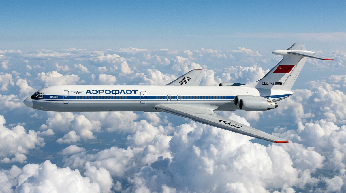 В середине 1950-х годов Советский Союз стоял на пороге новой эры гражданской авиации. Страна нуждалась в дальнемагистральном пассажирском самолёте, способном связать Москву с Владивостоком, Гаваной и Улан-Батором без посадок. Ту-114 на базе бомбардировщика Ту-95 уже показала себя, но был нужен чисто пассажирский лайнер — надёжный, экономичный и престижный. Задачу поручили ОКБ Ильюшина под руководством Сергея Владимировича Ильюшина. В 1959 году стартовала разработка Ил-62. Конструкторы выбрали классическую схему с четырьмя турбореактивными двигателями НК-8 вдали от фюзеляжа — на пилонах под крылом и в хвостовой части. Это решение минимизировало риск пожара и шум в кабине. Первый прототип взлетел 3 января 1963 года на аэродроме Ходынка. Пилотировал его Владимир Коккинаки, легендарный лётчик-испытатель. Ил-62 сразу впечатлил: максимальная скорость 900 км/ч, дальность полёта до 10 000 км с 186 пассажирами. Первоначально фюзеляж был круглым, но после критики (пассажиры жаловались на теснот