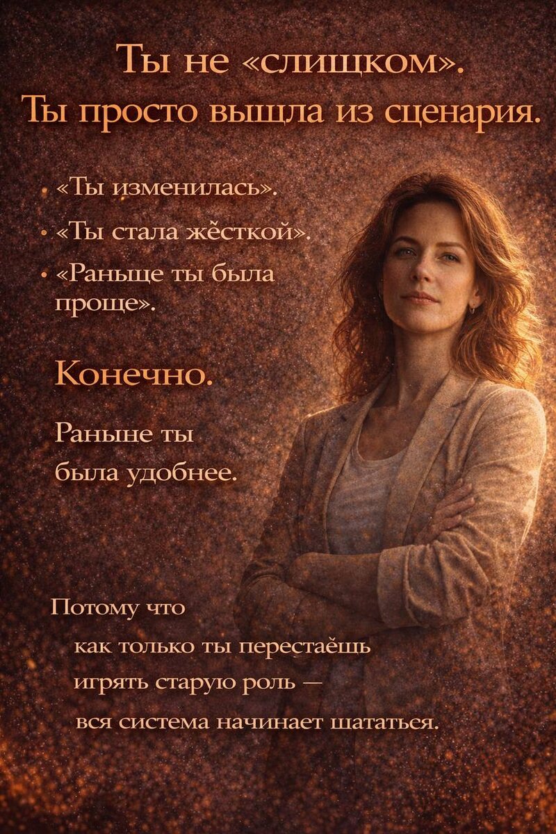 ». Ты просто вышла из сценария. Когда начинаешь меняться, старые партнёры вдруг говорят: «Ты изменилась». «Ты стала жёсткой». «Раньше ты была проще». Конечно. Раньше ты была удобнее. И вот здесь самое важное: выдержать. Потому что как только ты перестаёшь играть старую роль — вся система начинает шататься. Воскресенье 16:00