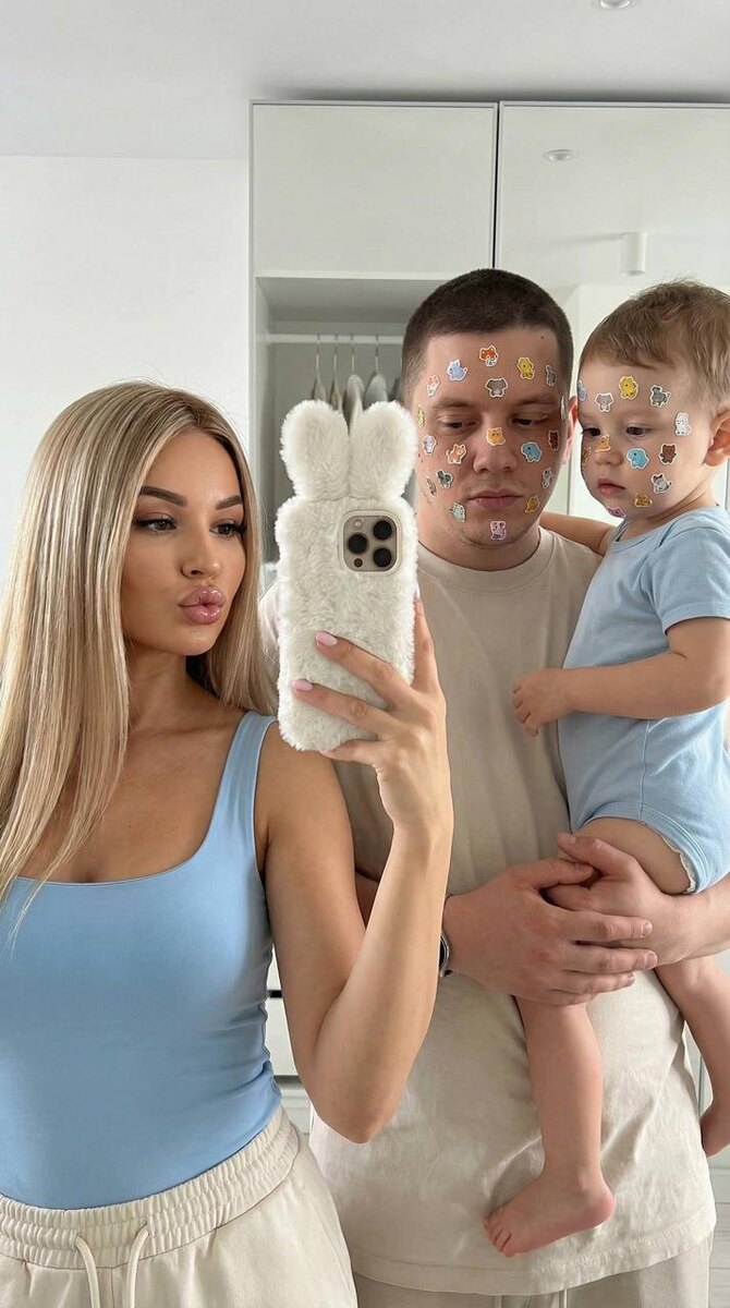 Модель: Nano Banana Сгенерировать🪄 Не меняй черты лица строго !!!! Создай селфи. Кожа детализированная, естественная Девушка делает селфи с помощью телефона в зеркало. Рядом мужчина который держит маленького ребёнка на руках. Лица у них у всех покрыты мелкими наклейками стикерами в виде животных Девушка одета в голубую майку и светлые штаны домашние Волосы блестящие длинные прямые Губы в блеске, делает губами уточку Мужчина одет в светлое домашнее оверсайз Ребёнок в голубом Боди Девушка смотрит в телефон Рука девушки вытянута вперёд, пальцы изящно обхватывают корпус смартфона. Он в обьемном пушистом чехле в белом с ушками На фоне белый шкаф и светлый интерьер комнаты Кожа подсвечена Глаза у мужчины опущены Качество 8К У мужчины легкая улыбка
