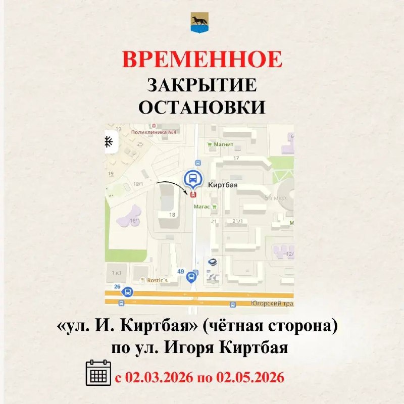 В связи с проведением работ по строительству объекта «Улица Киртбая от проспекта Ленина до улицы 1 «З» в г. Сургуте» будет производиться строительство инженерных сетей по ул. Игоря Киртбая. Остановка «ул. И. Киртбая» (чётная сторона) по ул. Игоря Киртбая на период с 02.03.2026 по 02.05.2026 будет закрыта. Для поездок предлагаем воспользоваться остановкой «Нефть Приобья» по ул. Игоря Киртбая. Просим пассажиров учесть данную информацию при планировании маршрутов. Мы в Max | ВК | ОК | Телеграм | Официальный портал | Дзен