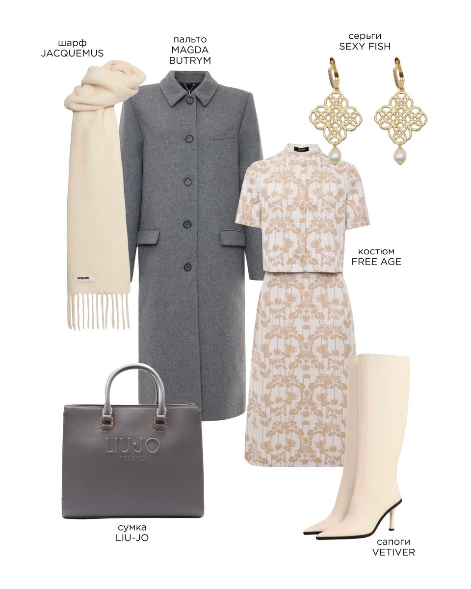 Год открылся как переход от подходов «quiet luxury» к более выразительной, но всё ещё сбалансированной эстетике. Современная палитра — это сочетание спокойствия и уверенности, сложных нейтралов и продуманных акцентов, которые легко вписываются в капсулу гардероба. ☁️ Cloud Dancer и новая светлая база Главным ориентиром сезона стал мягкий холодный белый с названием Cloud Dancer. Это не стерильный белый и не кремовый бежевый, а чистый оттенок с едва заметной прохладой. Он работает в костюмной шерсти, матовом шёлке и плотном хлопке. В монохроме создаёт ощущение архитектуры. В сочетании с ледяным голубым или графитом звучит современно и собранно. Такой белый постепенно вытесняет классический бежевый, который последние годы служил универсальной базой. Костюм, пальто, сапоги, сумка, шарф, серьги 🧊 Ледяной голубой и цифровая прохлада Отдельной линией проходит холодный голубой, который модные редакторы называют digital или ice blue. Этот оттенок привносит в гардероб ощущение современности без