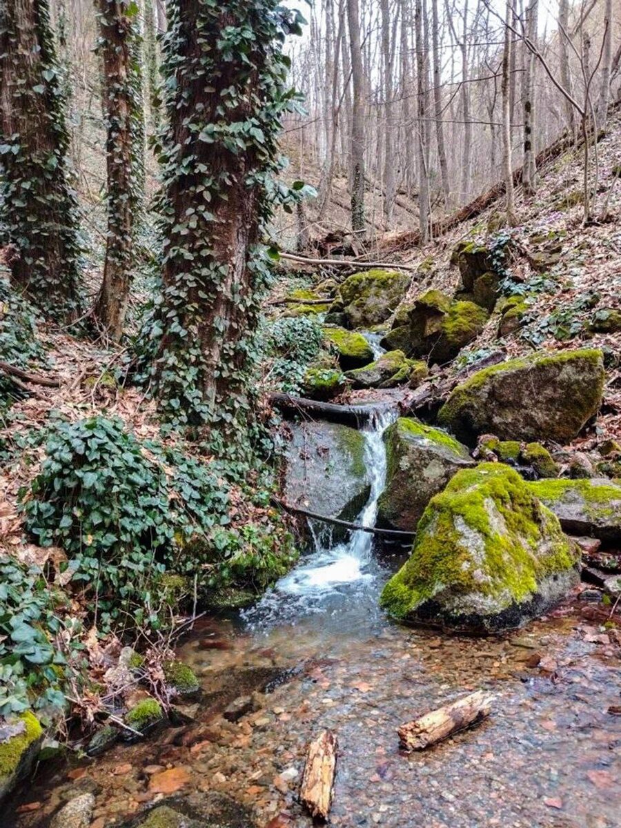 Сюда редко заходят туристы: неприметная тропа заросла кустарником и упавшими деревьями. С крутых склонов ущелья срываются сезонные водопадики с Азишского хребта, где тает снег. Талые воды ручьев бурно несутся вниз и впадают в Белую. Высокая влажность покрывает стволы лианами колхидского плюща, папоротниками и мхами — лес зелен и наряден даже ранней весной. Тропа ведёт по левому берегу Гранитного ущелья. В узких местах скалистые берега сужаются до двух метров, а Белая с рёвом бьётся о гранит, точа монолит. 📸 lagonakitravel ✈️ Подписаться | ПРО ЮГ 🇷🇺 ПРО ЮГ в Max