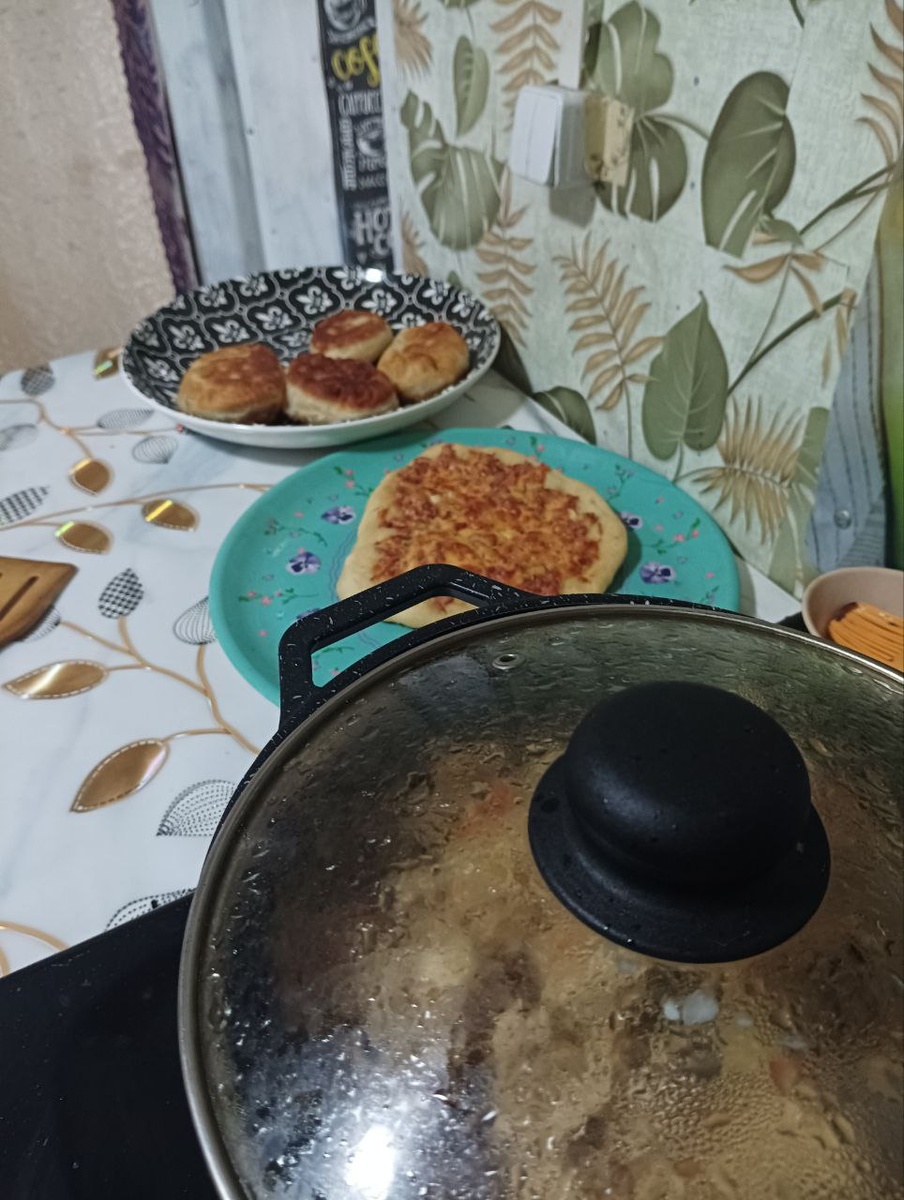 Сегодня приготовила плов, и уже испекла пиццу, пирожки с луком и яйцом. В духовке ещё пекутся сосиски в тесте.