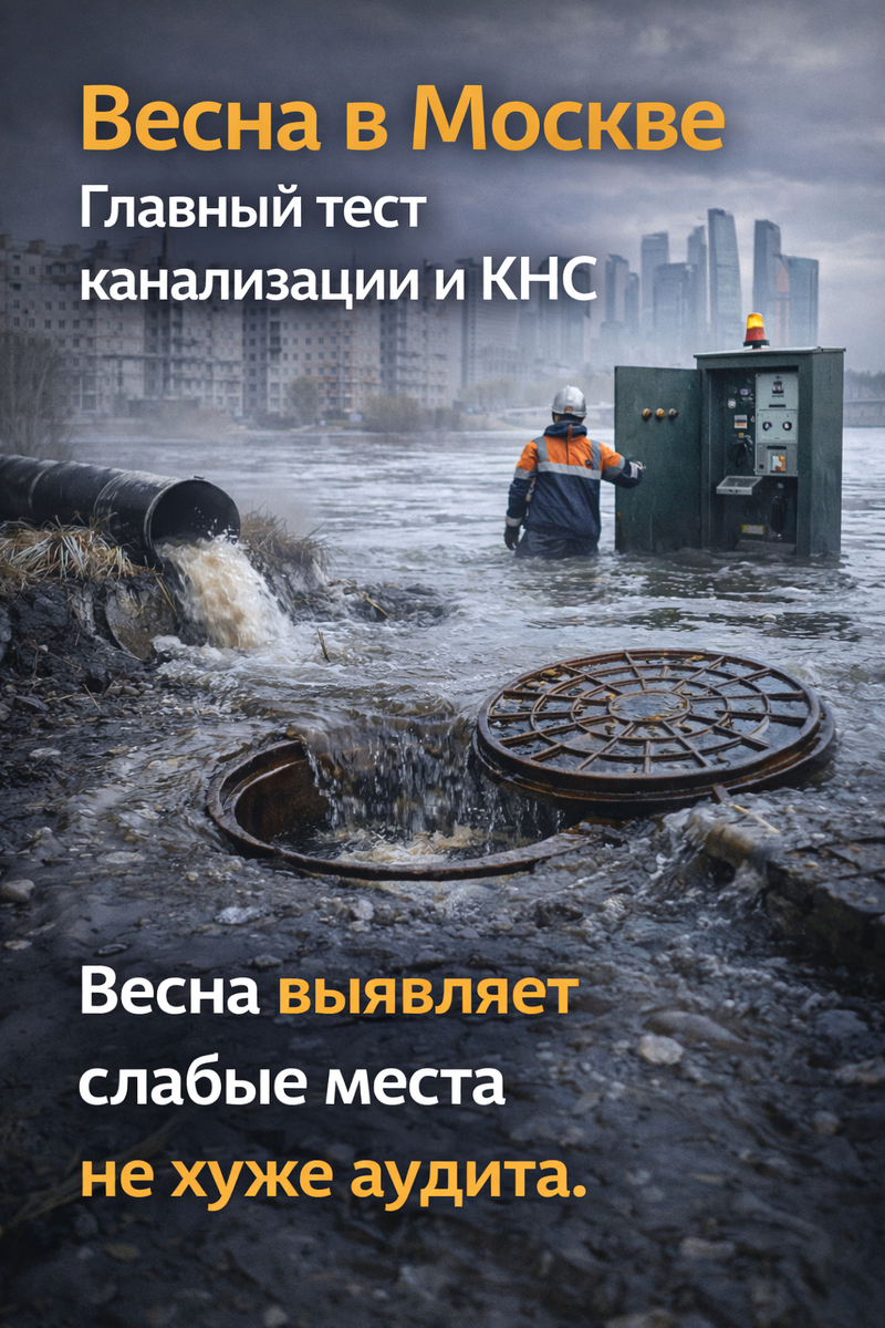 Когда в Москве начинается активное таяние снега, нагрузка на канализационные сети и КНС возрастает кратно. И это не гипотеза — это ежегодный эксплуатационный факт.