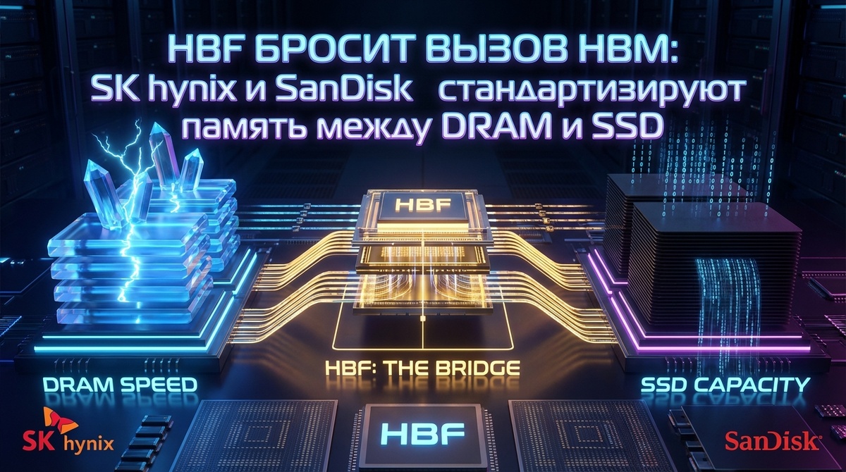 Индустрия искусственного интеллекта подошла к рубежу, где существующих типов памяти перестало хватать. SK hynix и SanDisk решили проблему радикально созданием принципиально нового класса, который займет нишу между HBM и SSD. Технологию назвали High Bandwidth Flash и уже запустили ее международную стандартизацию. Два крупных игрока полупроводникового рынка объявили о старте работ по стандартизации HBF в рамках Open Compute Project. Соответствующее решение было принято на встрече в калифорнийском офисе SanDisk 25 февраля. Стороны сформируют рабочую группу, которая займется разработкой открытых спецификаций для нового типа памяти. Современные системы искусственного интеллекта работают с двумя уровнями памяти. С одной стороны HBM, обеспечивающая рекордную пропускную способность, но ограниченная по объему и требующая постоянного энергопотребления для хранения данных. С другой — твердотельные накопители, способные вместить терабайты информации, но проигрывающие в скорости доступа. High Bandw