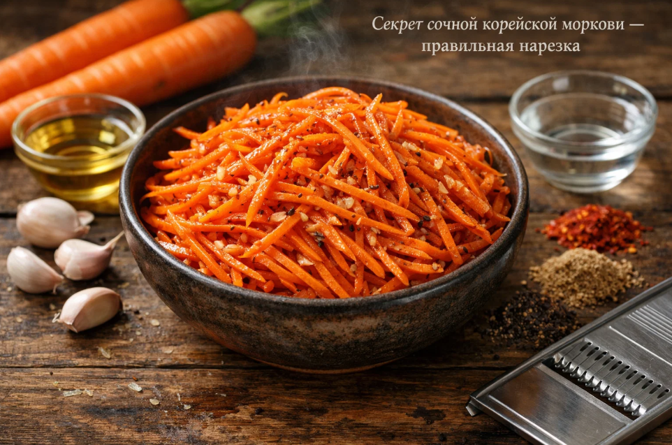 Корейская морковь давно перестала быть для нас экзотикой. Этот яркий, острый салат занял почётное место на наших столах, стал неотъемлемой частью праздничных застолий и повседневного меню. Но почему у одних хозяек морковь по-корейски получается сочной, ароматной и невероятно вкусной, а у других — сухой и невыразительной? Секрет кроется не только в специях и маринаде, но и в способе нарезки самой моркови.