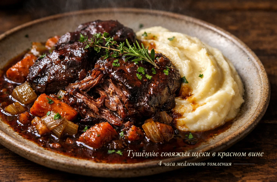 Первое, что нужно понять о приготовлении говяжьих щёк — это необходимость терпения. Здесь не получится сэкономить время, включив огонь посильнее. Нет, это блюдо требует медленного, почти медитативного процесса. Четыре часа томления на самом тихом огне — именно столько нужно, чтобы грубые волокна превратились в шелковистую массу, которая буквально тает во рту.